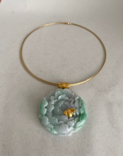 18K CARVED LIGHT GREY WITH GREEN JADEITE JADE PEONY PENDANT