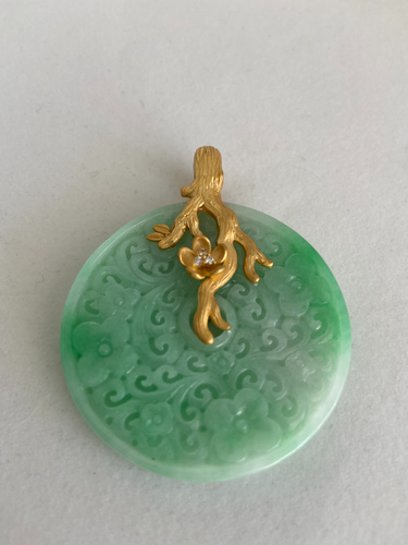 18K APPLE GREEN JADE PENDANT WTH CARVED CHERRY BLOSSOM