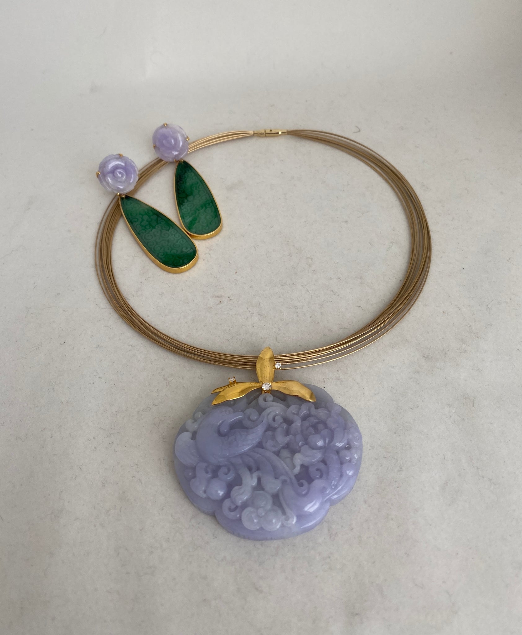 FABULOUSLY CARVED LAVENDER JADEITE JADE PENDANT, DEPICTING A PHOENIX AND PEONY FLOWERS. 18 KARAT LEAFS ON TOP. DIAMONDS. DESIGNED BY MEI WANG.GOLD CHAIN SOLD SEPARATELY.