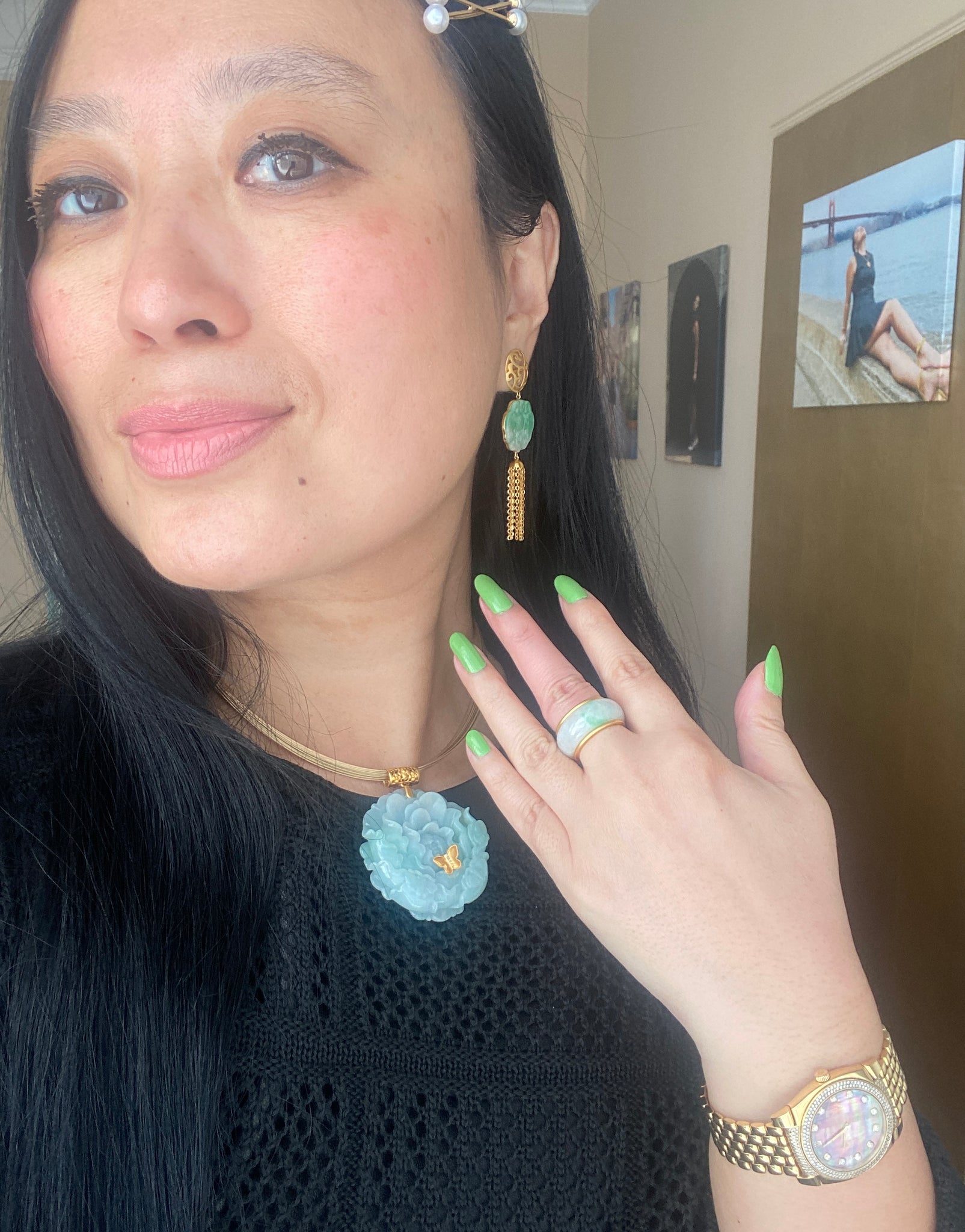 FABULOUSLY CARVED GREEN JADEITE JADE PEONY PENDANT WITH A GOLD BUTTERFLY RESTING ON IT. 18 KARAT GOLD AND DIAMONDS. ONE OF A KIND PIECE DESIGNED BY MEI WANG. GOLD CHOKER SOLD SEPARATELY.
