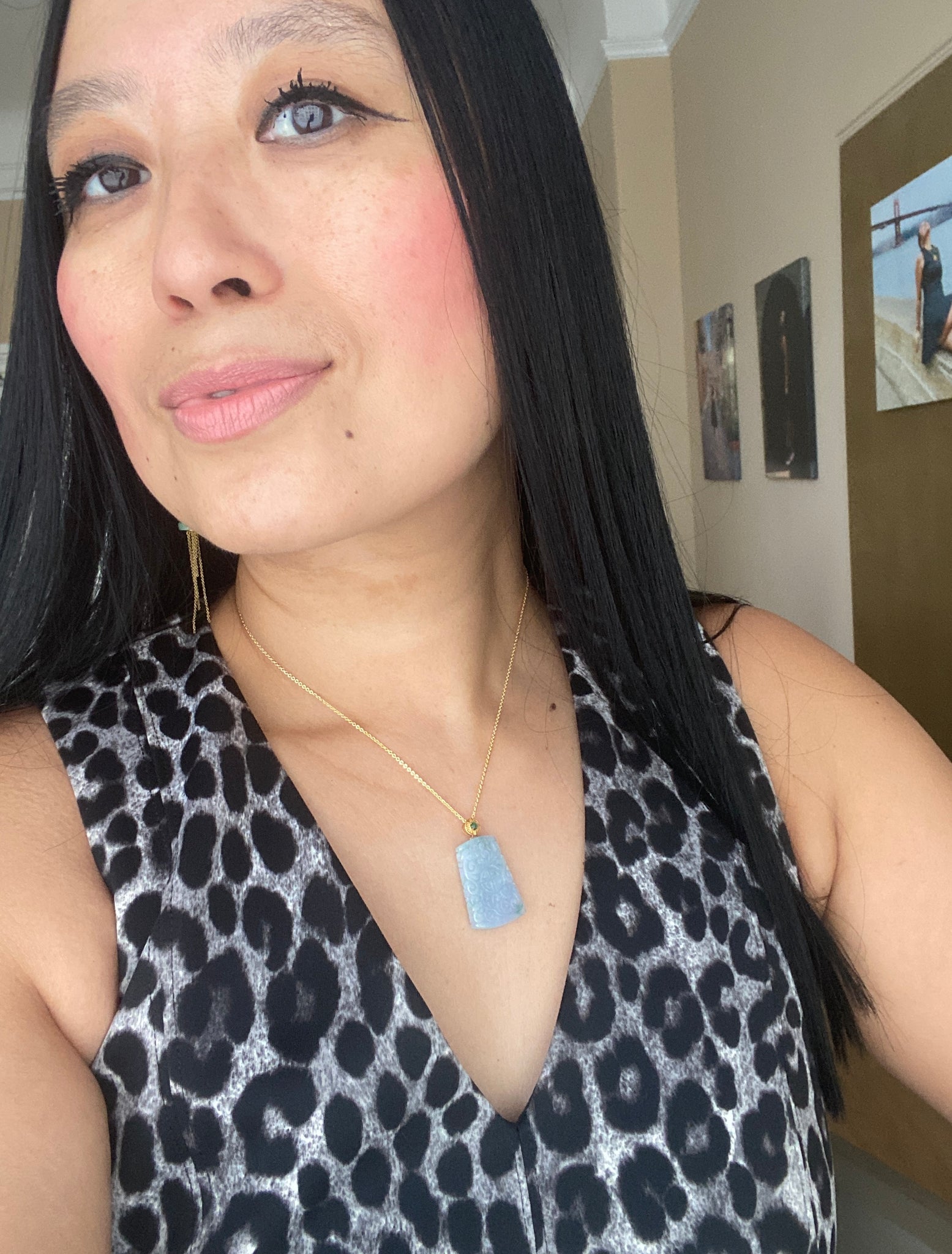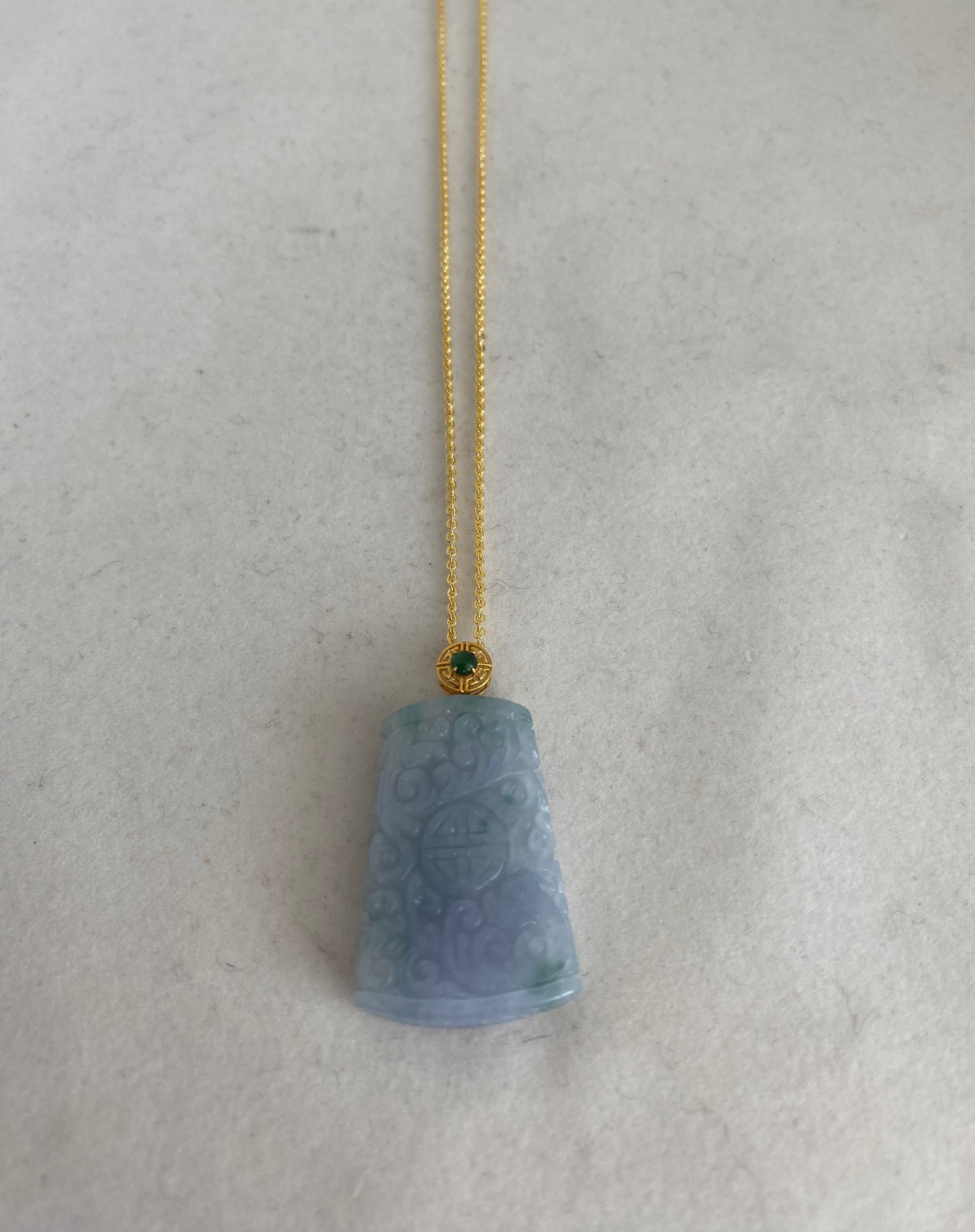 GORGEOUS CARVED JADE PENDANT, BLUE/LAVENDER WITH A SINGLE GREEN CABOCHON JADE ON TOP, SETTING IN 18K YELLOW GOLD. GOLD CHAIN SOLD SEPARATELY.
