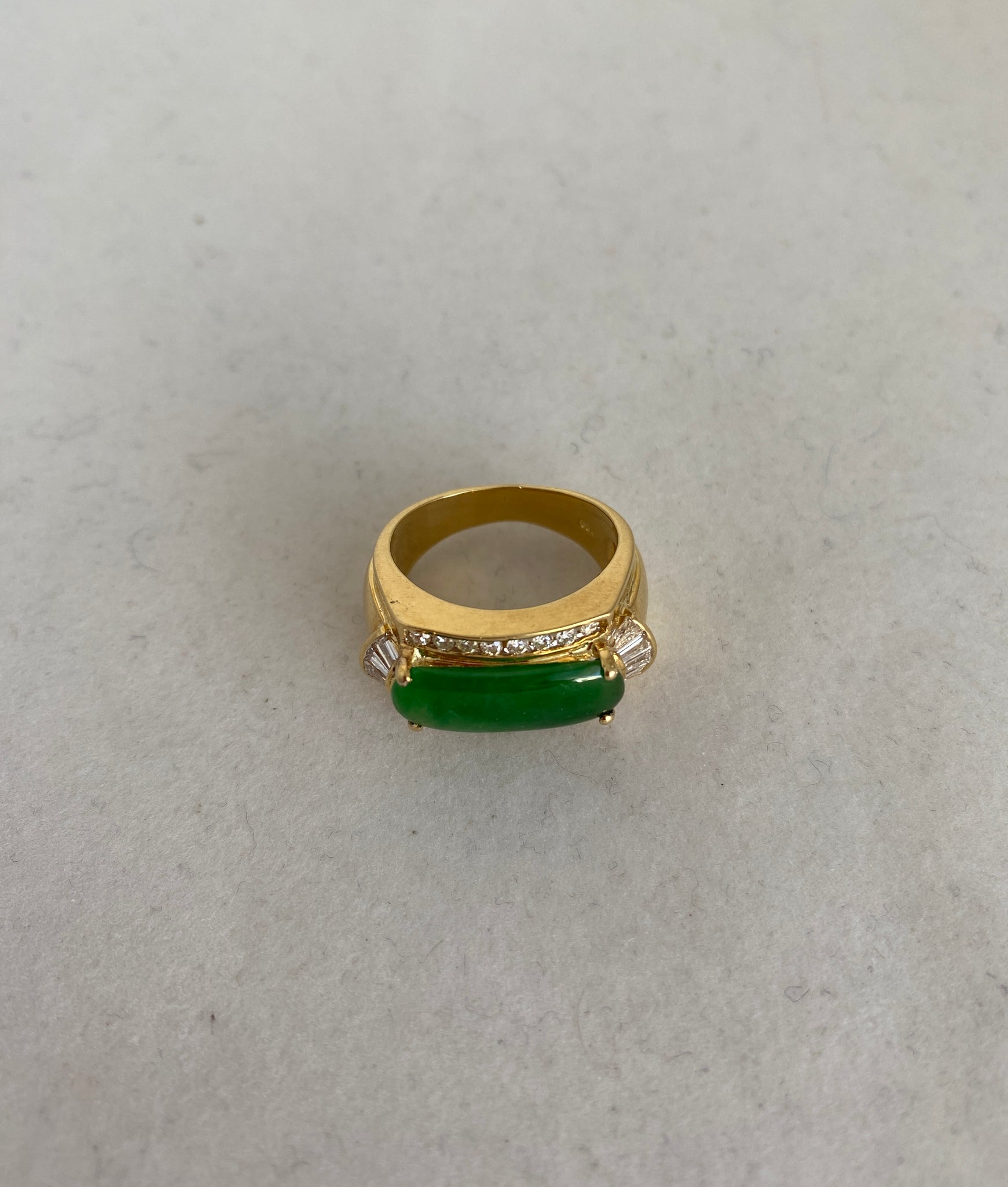 BEAUTIFUL GREEN JADEITE JADE RING, 16 BRILLIANT CUT DIAMONDS, 10 BAGUETTE DIAMONDS. 18K YELLOW GOLD.