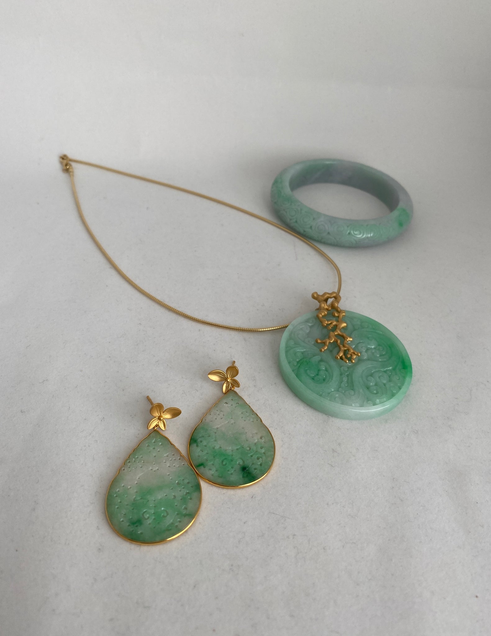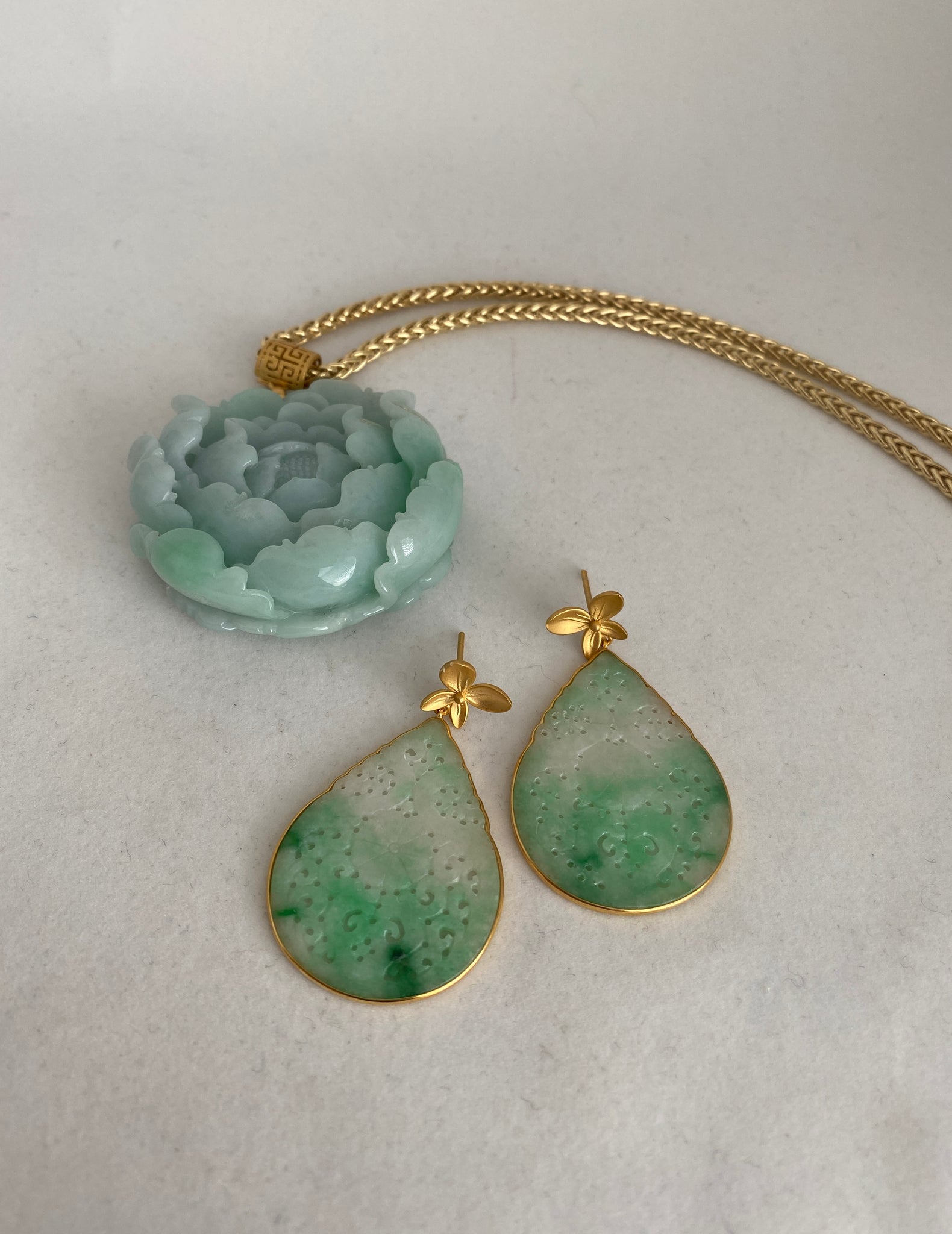 GORGEOUSLY CARVED APPLE GREEN DROP EARRINGS, DEPICTING ASIAN MOTIFS AND FLOWER IN THE CENTER. 18K YELLOW GOLD. ABOUT 1 7/8" LENGTH AND 1 1/8" WIDE. ONE OF A KIND PIECE BY MEI WANG.