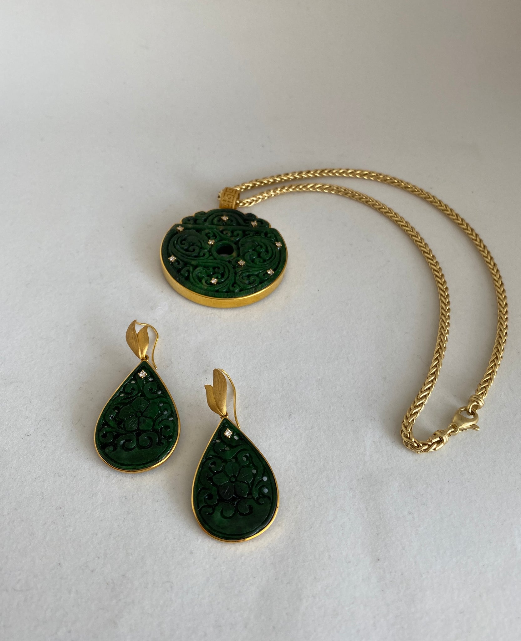 18K CARVED DARK GREEN JADE  DROP EARRINGS