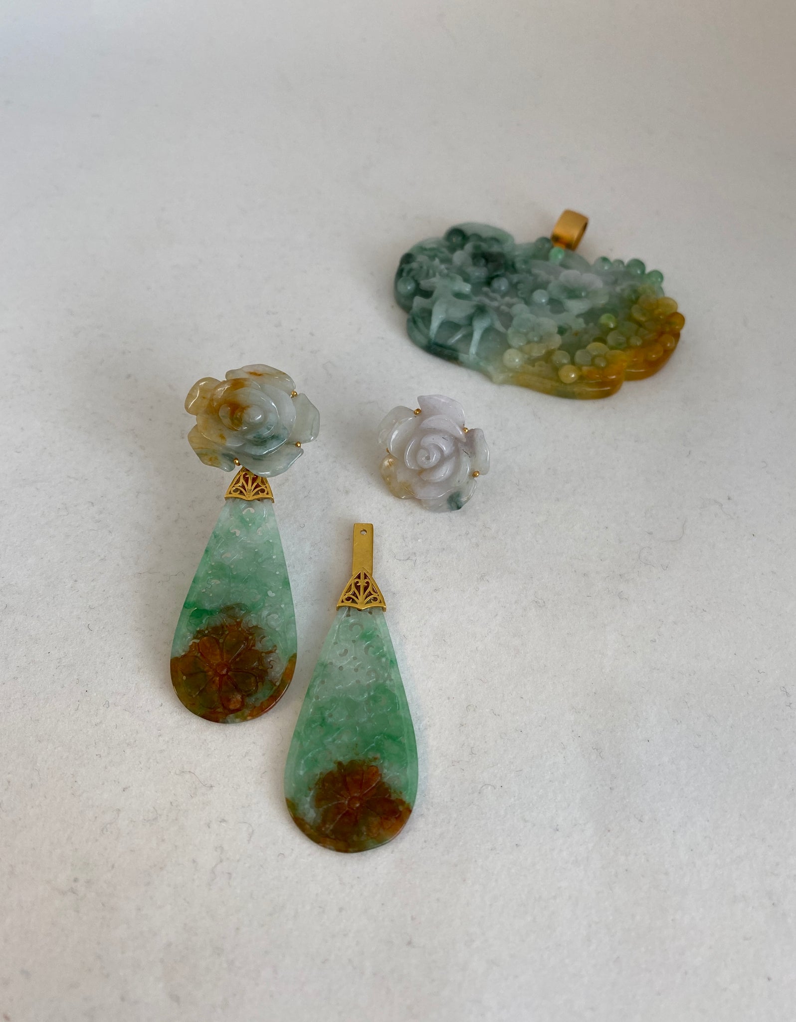 MULTI COLOR CARVED JADE EARRINGS, WITH A PAIRS OF CARVED PEONY ON TOP, THESE FABULOUS EARRINGS ALLOW YOU WEARING THE PEONY AS A PAIRS OF STUDS EARRINGS , OR WEARING AS PAIRS OF HANGING EARRINGS. 18K GOLD. PIERCED ONLY. PLEASE CONTACT MEI WANG IF THE ITEMS ARE NO LONGER AVAILABLE.