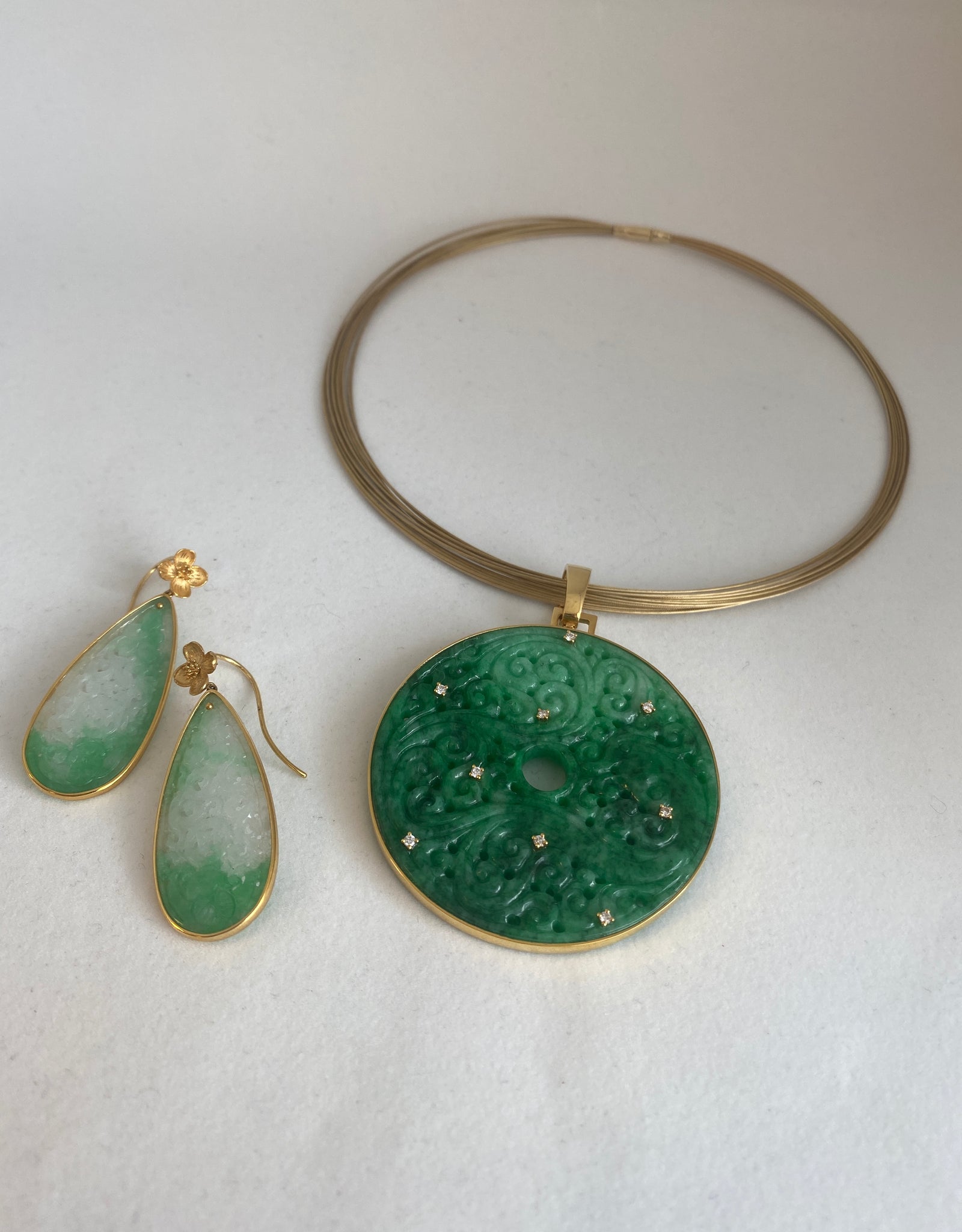 GORGEOUS CARVED JADE DROP EARRINGS, WITH BRIGHT GREEN , 18K YELLOW GOLD . BY Mei Wang.