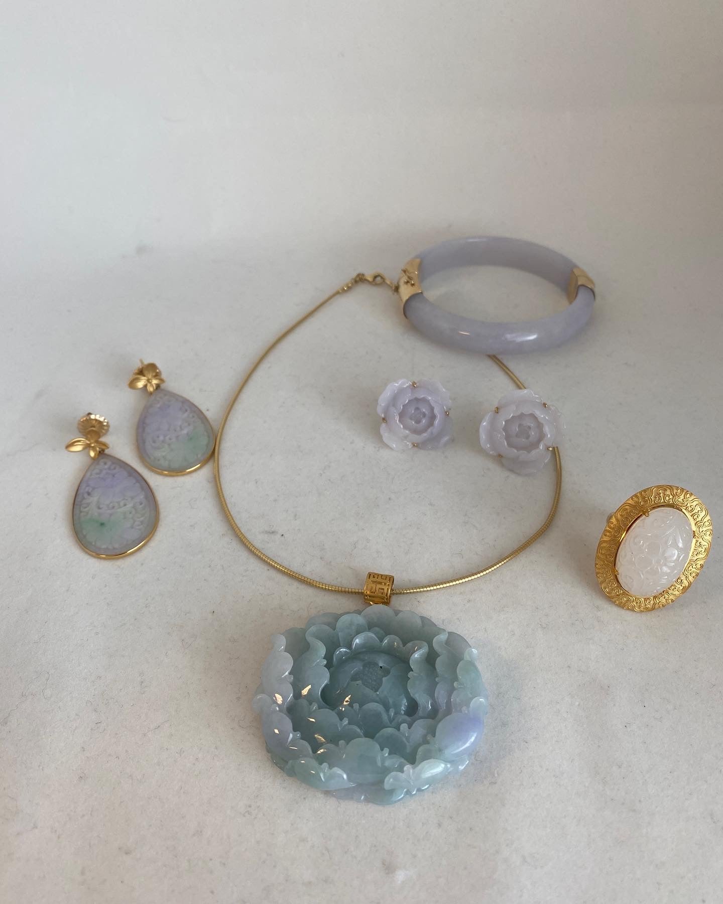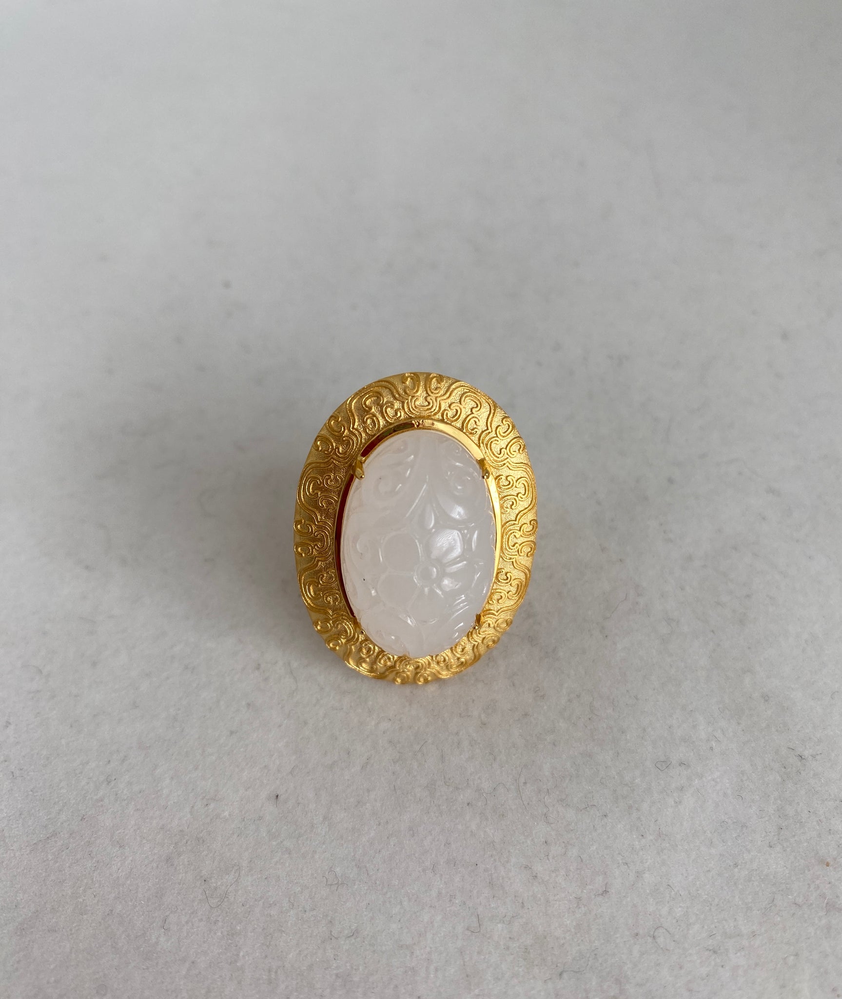 GORGEOUSLY CARVED SNOW WHITE JADE RING, 18K YELLOW GOLD. SIZE 7 3/4. CONTACT MEI WANG IF THIS ITEM IS SOLD OUT.