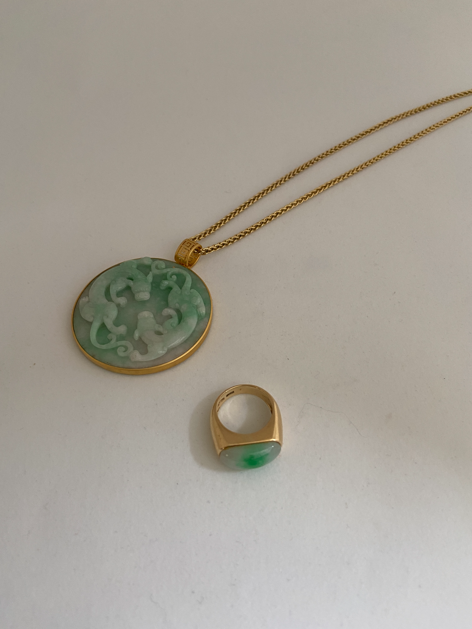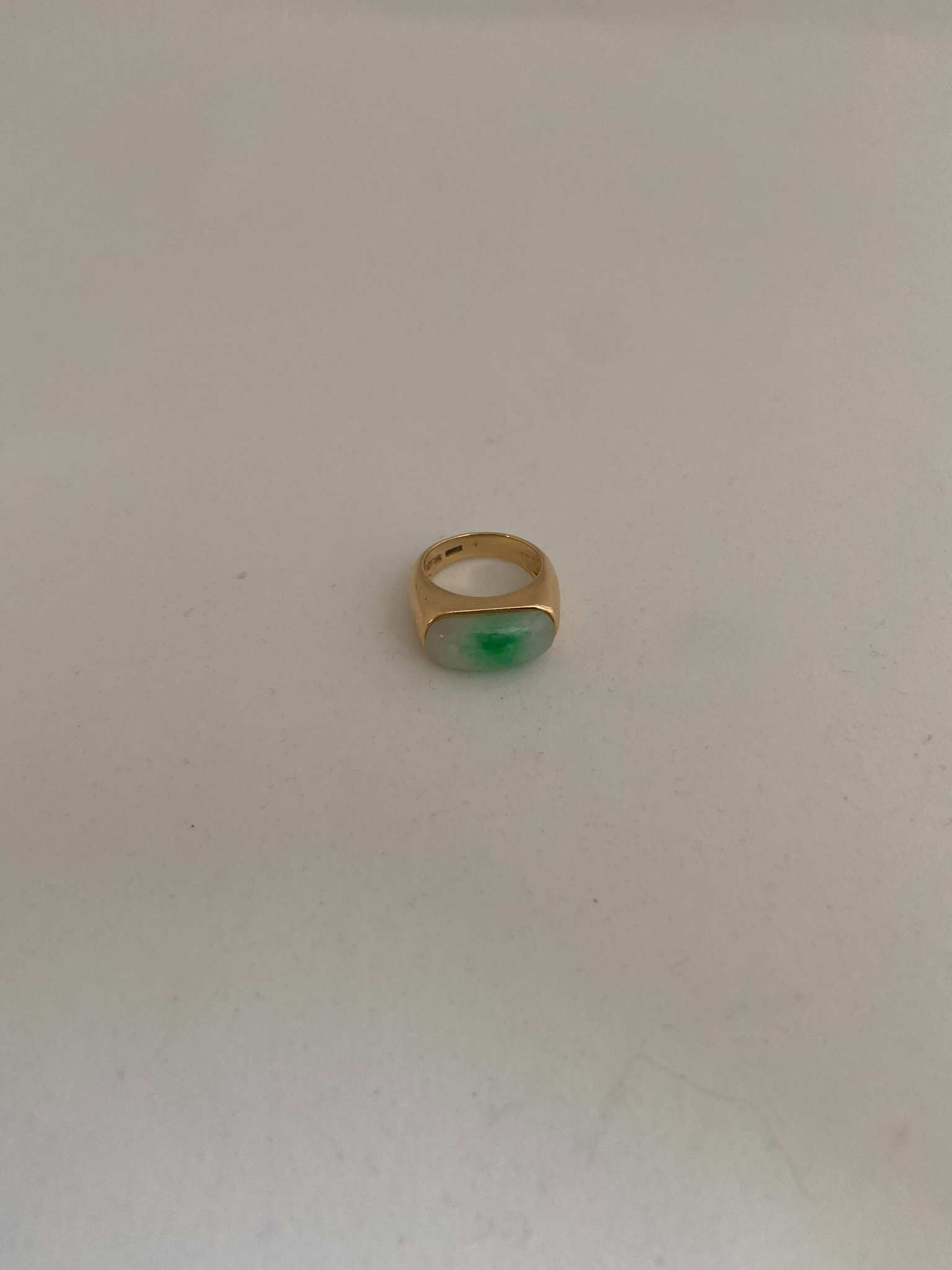 CLASSIC JADE SASSLE RING, APPLE GREEN COLOR JADE SETTING IN 18K YELLOW GOLD, SIZE IS 6, BUT CAN BE ADJUSTED BY ONE SIZE DOWN OR UP. ESTATE PIECE, STAMPED "GUMP'S" INSIDE THE SHANK OF THE RING.