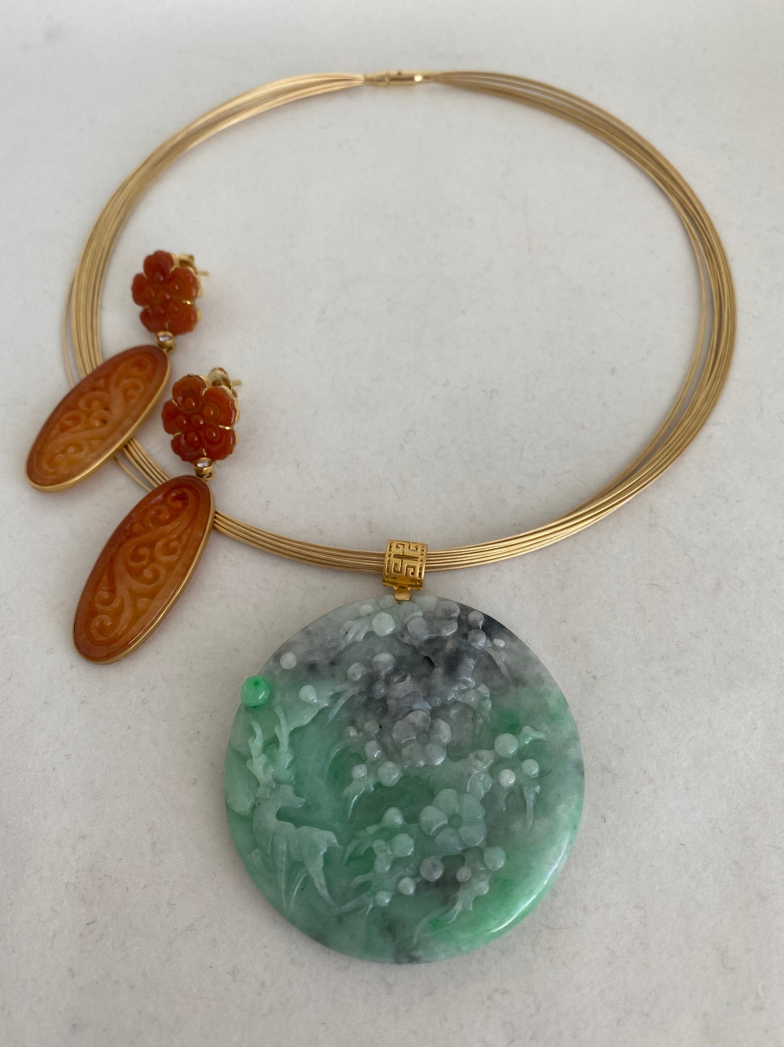 FABULOUSLY CARVED JADEITE JADE PENDANT, DEPICTING A DEER STANDING UNDER PLUM TREE. BRIGHT GREEN/ LIGHT GREEN / CHARCOAL GREY.  MEASURED ABOUT 2" IN DIAMETER. ONE OF A KIND PIECE BY MEI WANG. GOLD NECK WIRE SOLD SEPARATELY.