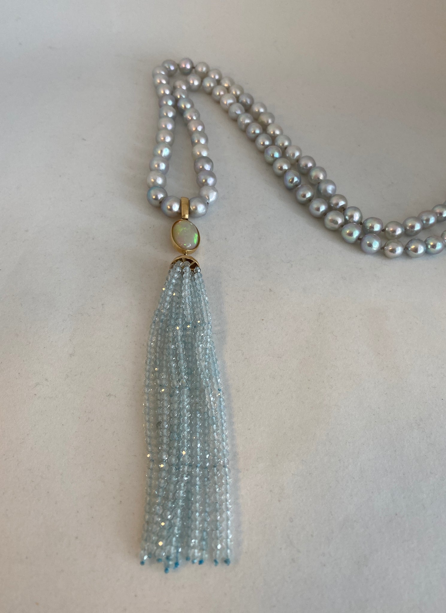 8.5-9.5MM BAROQUE BLUE AKOYA PEARL ROPE WITH REMOVABLE TASSEL WITH 11MM X 16.5MM ETHIOPIAN OPAL BEZEL SET IN 18-KARAT YELLOW GOLD, AND 14 STRANDS OF BLUE TOPAZ FACETED RONDELLES WITH GOLD CAP AND HINGED BAIL.