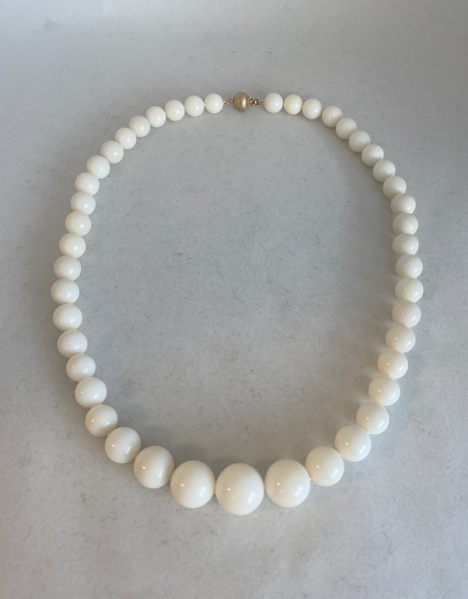 FABULOUS GRADUATED WHITE CORAL NECKLACE, 9MM-14MM. 18.5" LONG. 14K-KARAT YELLOW GOLD BALL CLASP.