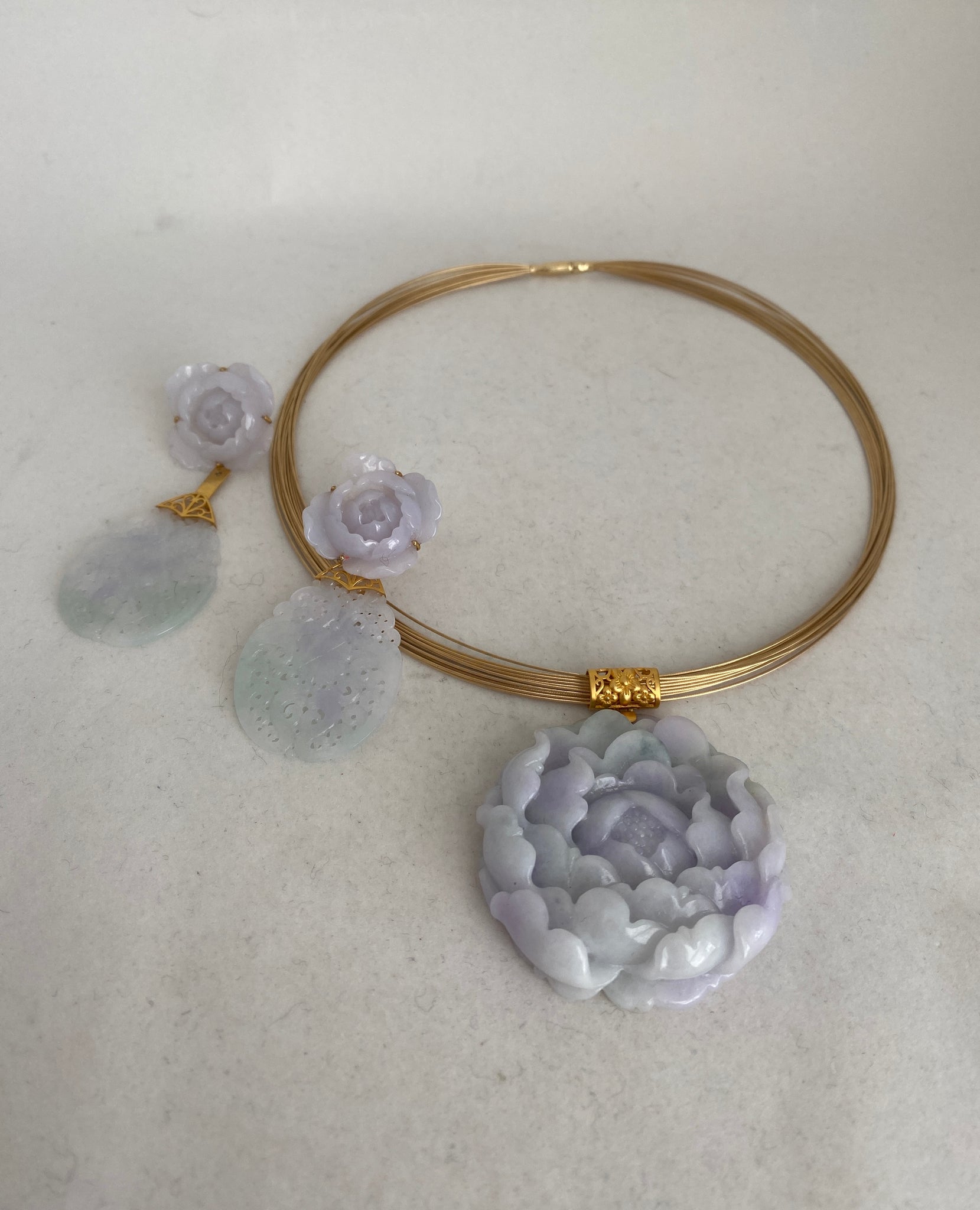 TWO IN ONE CARVED LAVENDER JADE PEONY EARRINGS, TOP PEONY PART CAN BE WORE AS A PAIRS OF POST EARRINGS BY ITSELF. 18K YELLOW GOLD.